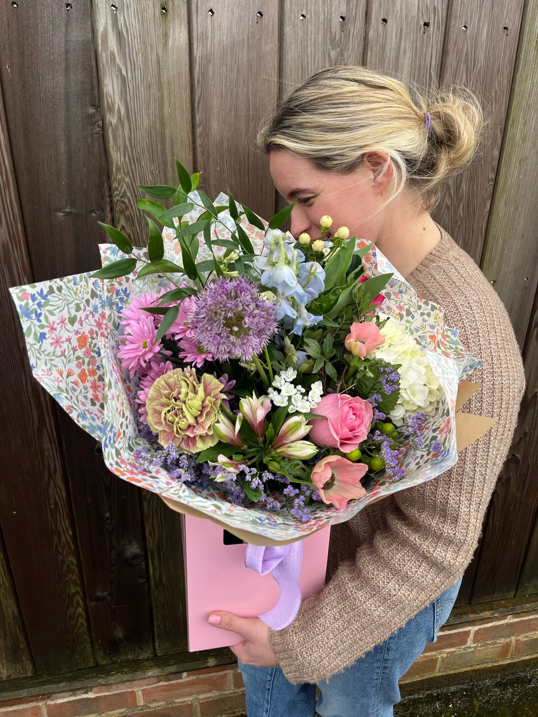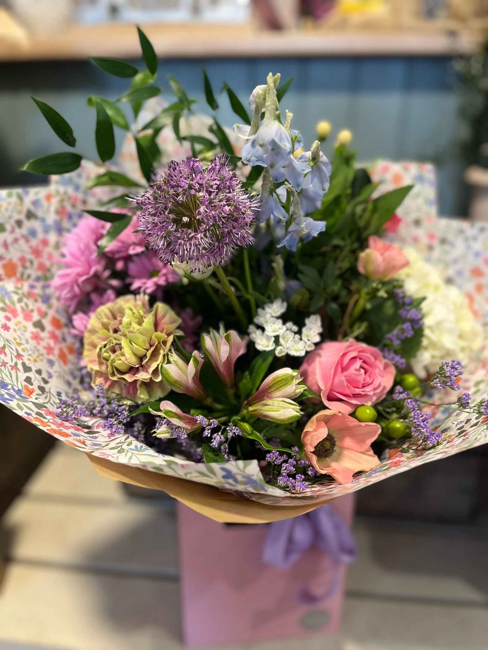 Surprise the Mother figure in your life with a beautiful bouquet of country garden florals ~ filled with spring seasonal florals, roses, hypericum and scented stocks.